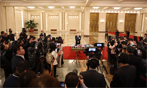 Huang Runqiu, China's Minister of Ecology and Environment, displays an environmental DNA sequencing chip to show that China's environmental supervision has entered a new phase, during an interview after the closing meeting of the fourth session of the 14th National People's Congress (NPC) at the Great Hall of the People in Beijing, on March 12, 2026. Photo: VCG