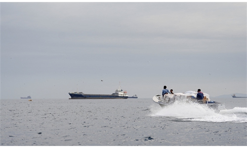 A ship is seen off the coast of Ras al-Khaimah, United Arab Emirates, the day after the failure of US-Iran peace talks on April 13, 2026. Photo: VCG