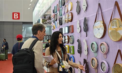 Overseas buyers talk with an exhibitor (right) during the second phase of the 139th edition of the China Import and Export Fair, also known as the Canton Fair, which opened in Guangzhou, South China's Guangdong Province on April 23, 2026. In the festive decoration and gifts exhibition area, a dazzling array of gifts from China attracted overseas buyers to browse and place orders. Photo: VCG