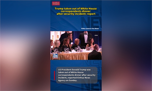Inset: A photo posted by US President Donald Trump on social media shows law enforcement forces detaining a suspect following a shooting incident at the White House Correspondents' Dinner on the night of April 25, 2026. Photo: VCG