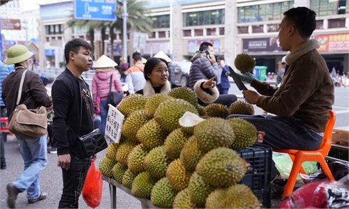 Meanwhile, the topic of durian prices hitting record lows and people achieving the "freedom" to purchase the exotic and once expensive tropical fruit became a major topic on Chinese social media platforms on Monday after a weekend that witnessed a huge quantity of the crop arrive at Chinese sea and land ports.