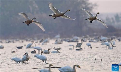 Migratory swans flock to Yellow River wetland in Sanmenxia to spend winter