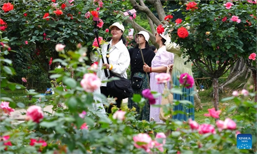 People enjoy Rosa Chinensis blossoms in Nanning, China's Guangxi