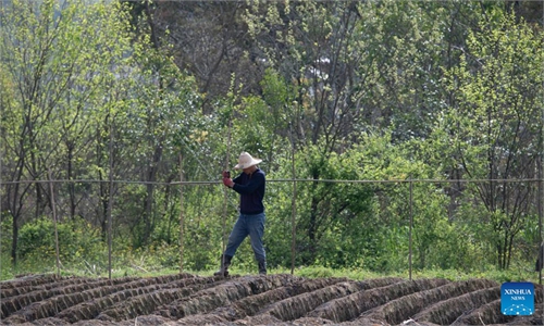 Farmers perform flower thinning, pollinating work as pear trees bloom in Hebei