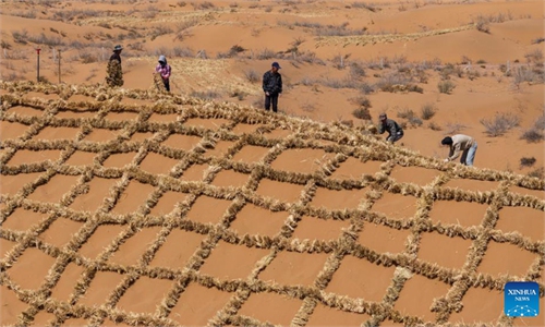 Workers upgrade desert barriers in Tengger Desert, China's Ningxia