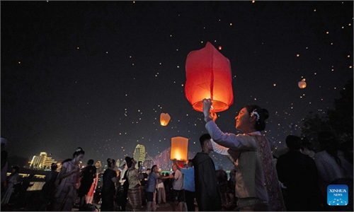 People fly Kongming lanterns in Jinghong, China's Yunnan