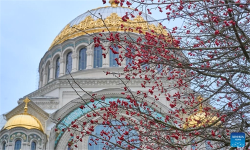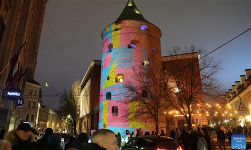 People view light show during light festival "Staro Riga 2025" in Latvia