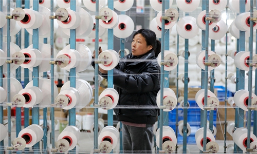 Workers fill orders for jacquard fabrics destined for export at a textile company in Nantong, East China's Jiangsu Province on November 26, 2025. The city has actively promoted industrial transformation by implementing technology upgrades, enhancing market competitiveness, and maintaining strong momentum in high-quality development. Photo: VCG