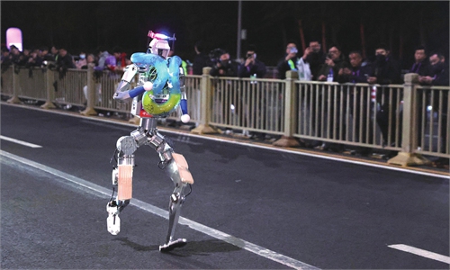 The second humanoid robot half marathon took place in Beijing E-Town on Sunday. More than 100 robot teams participated, including five international teams. A total of 26 brands and more than 300 humanoid robots competed, official data showed.