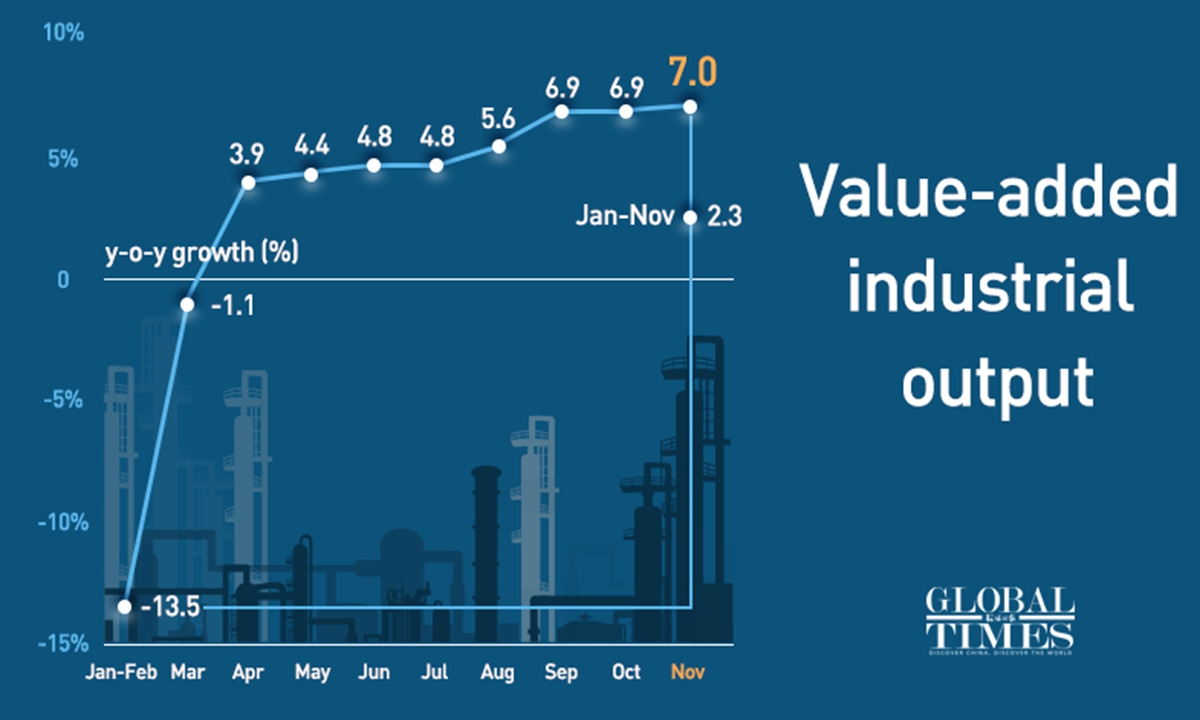China's industrial added value surged 7% in November, in line with market expectations, and faster than 6.9% growth in October: official data.