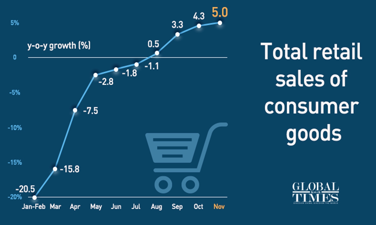 China's retail sales continue to recover, climbing by 5 percent in November; industrial output also continues to grow, both in line with expectations, showing strong growth momentum as the world's second-largest economy emerges from the impact of COVID-19.