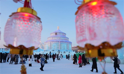 People visit the Harbin Ice-Snow World in Harbin, northeast China's Heilongjiang Province, Jan. 23, 2025. As of 10 p.m. Sunday, the bustling Harbin Ice-Snow World had received more than 2 ...
