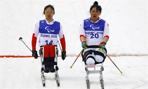 China's Paralympic debutant Liu Mengtao claimed the Para biathlon men's middle distance sitting title at the National Biathlon Center in Zhangjiakou on Tuesday. China's Shan Yilin ranked fourth in the para biathlon women's middle distance sitting. Photos: Cui Meng/GT
