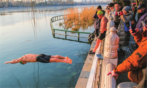 Around 1 pm, the surface of Beijing's Shichahai Lake carries a bite of cold. The wooden boardwalk along the shore feels damp and chilly, as several middle-aged and elderly swimmers ...