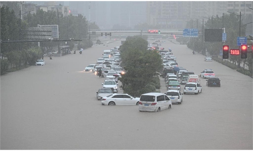 The clearance work of the main avenues in the downtown area of the flood rampaged Zhengzhou, capital of Central China's Henan Province, has been completed, Global Times reporters saw on the site. Accumulated rainwater is still above people's knees on some roads as of afternoon of July 21.