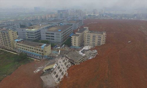 A landslide hit an industrial park in Shenzhen City in south China's Guangdong Province Sunday morning, crunching a building. Casualties are feared.