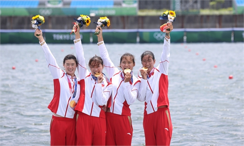China's national rowing team won in the women's quad sculls with a convincing performance in the final, bagging the 10th gold medal for Team China at the Tokyo Olympics. Photos: Cui Meng/GT