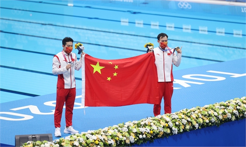 Chinese artistic swimmers Huang Xuechen and Sun Wenyan finished second in the free routine final, bagging a silver medal for China. The Chinese pair is 3.458 points behind the winners of the Russian Olympic Committee team.(Photos: Cui Meng/Global Times)