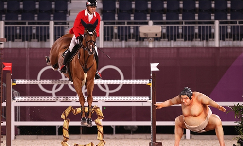 Many Chinese netizens expressed sympathy for riders and their horses at the Tokyo Olympic Games after some photos and clips showing the animals becoming spooked by a giant sumo wrestler statue went viral on Chinese social media on Wednesday night.