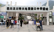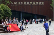 A group of tourists take a photo with a Party flag in front of the Wenchuan Earthquake Memorial Museum in Wenchuan County, Sichuan Province.