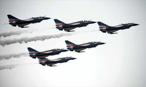 J-10 jet fighters of the Bayi Aerobatic Team of the Air Force of the Chinese People's Liberation Army perform a test flight ahead of the 10th China International Aviation and Aerospace Exhibition in Zhuhai, south China's Guangdong Province, Nov. 9, 2014. Some 700 exhibitors from at home and abroad with 130-plus planes will attend the six-day airshow starting on Nov. 11.