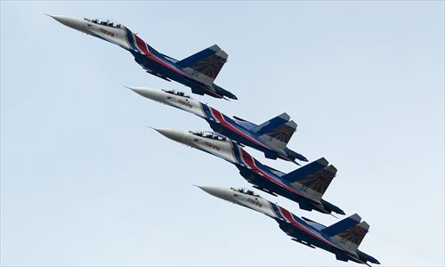 The Russian Knights team performs with Su-27 fighters at the 10th China International Aviation and Aerospace Exhibition in Zhuhai, Guangdong Province, on November 13. Photo: Cui Meng/GT