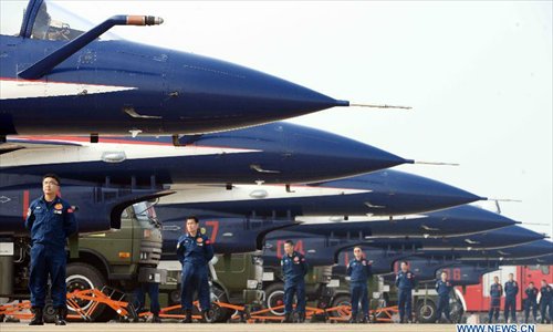 Members of China's Bayi Aerobatic Team, is seen with J-10 jet fighters on the runway at the 10th China International Aviation and Aerospace Exhibition in Zhuhai, south China's Guangdong Province, Nov. 11, 2014. This Tuesday marks the 65th anniversary of the establishment of the Air Force of the Chinese People's Liberation Army (PLA).