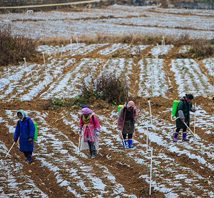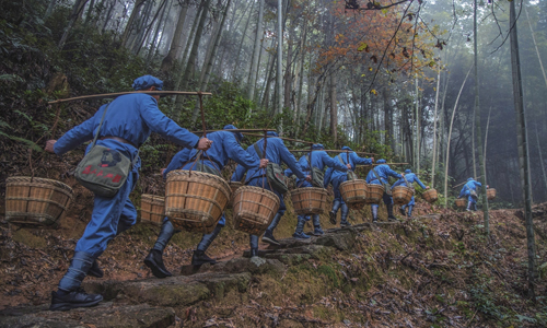 An army of 200 people, in full grey-blue uniforms with red-starred hats, are marching on a slippery and rugged stone road up to a hill in drizzle. The 10 men in front are carrying the baskets with shoulder poles.