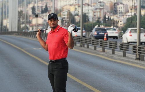US golfer Tiger Woods poses during an event to promote the upcoming Turkish Airlines Open 2013 golf tournament, on the Bosphorus Bridge that links the city's European and Asian sides in Istanbul on Nov. 5, 2013. The game will start on Thursday at the Mediterranean city Antalya of Turkey.