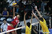 Huang Tien-Feng (L) of Chinese Tapiei spikes the ball against players of Iraq during the 2014 Asian Men's Club Volleyball Championship in Pasay City, the Philippines, April 16, 2014. Chinese Taipei won 3-0.