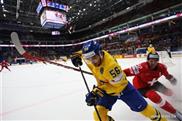 Erik Gustaffson (C) of Sweden vies with Nino Niederreiter (R) of Switzerland during IIHF Ice Hockey World Championship in Moscow, Russia, on May 15, 2016. Sweden won 3-2 in a shootout.