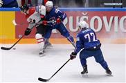 Pavel Poluektov (R) of Kazakhstan saves the goal from the shot of Mads Christensen of Denmark during IIHF Ice Hockey World Championship in Moscow, , on May 16, 2016. Denmark won 4-1.