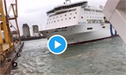 Footage shows the moment a ferry collided with a crane in a Barcelona harbor on Wed. The crane slowly fell down before being engulfed in flames as grey smoke billows into the air. There were no injuries, reports say.