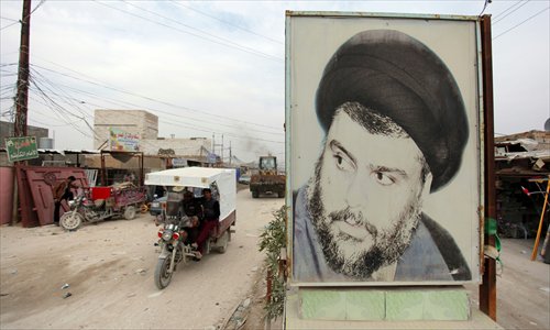 A three-wheeler drives past a portrait of Iraqi Shiite cleric Moqtada al-Sadr in the shrine city of Najaf in central Iraq on Sunday. Sadr, a major figure in the formation of post-Saddam Iraq, has announced his exit from politics two months before legislative polls. Photo: CFP
