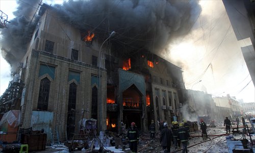 Heavy smoke billows from Baghdad’s historic Shorjah market, which dates to the Abbassid era over 700 years ago, after it was hit by two bomb blasts on Thursday, killing at least two people and wounding at least 11. Photo: AFP