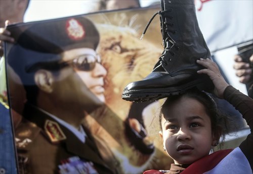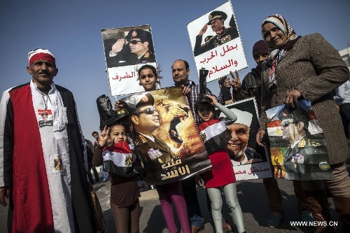 Military supporters demonstrate outside a police academy where ousted Islamic president Mohamed Morsi is trialed in Cairo, Egypt, on January 28, 2014. Egypt's Cairo Criminal Court decided to adjourn the trial of Morsi and some 130 others over the 2011 jailbreak to February 22, state TV reported on Tuesday. (Xinhua/STR)