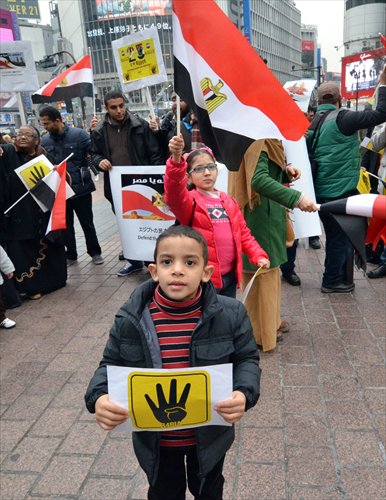 Egyptian residents in Japan hold banners and wave national flags at a rally in Tokyo on Friday to protest against unrest in Egypt on the third anniversary of the Egyptian revolution. Some 50 Egyptians staged a demonstration to support the democratic movement and protest against the military coup in Egypt. Photo: AFP