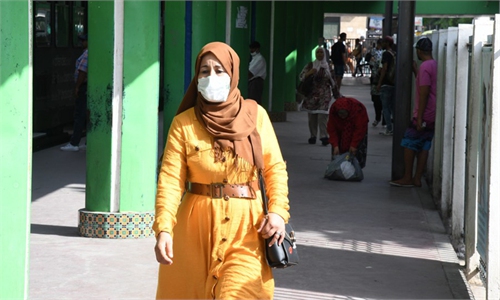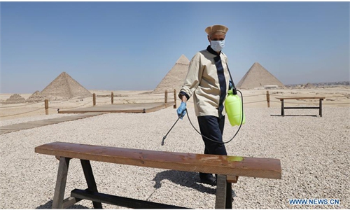 A man works at the construction site of the Grand Egyptian Museum in Giza, Egypt, on Aug. 25, 2020. Egypt has received 126,000 tourists since it reopened its seaside resorts to international flights and foreign tourists on July 1, after a three-month halt due to the coronavirus pandemic, Egyptian Minister of Tourism and Antiquities, Khaled al-Anany, said on Aug. 24. (Xinhua/Ahmed Gomaa)