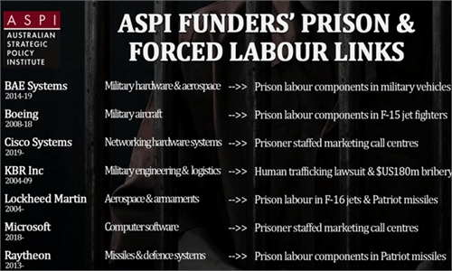 Australian media and scholars have exposed the right-wing think tank, the Australian Strategic Policy Institute (ASPI), which has previously released reports smearing China's policies in its Xinjiang region, for receiving millions of dollars in funding from corporations that directly profit from forced prison labor. It was also found to be acting as a lobbying tool for weapons makers to hype so-called security threat from other countries.