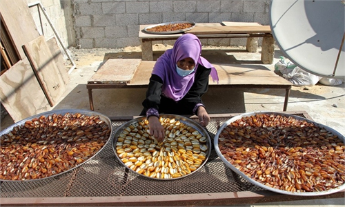 Amal Abu Sbitan, a Palestinian woman from Deir al-Balah in the central Gaza Strip, spends about 12 hours per day to make dates products with her neighbors.